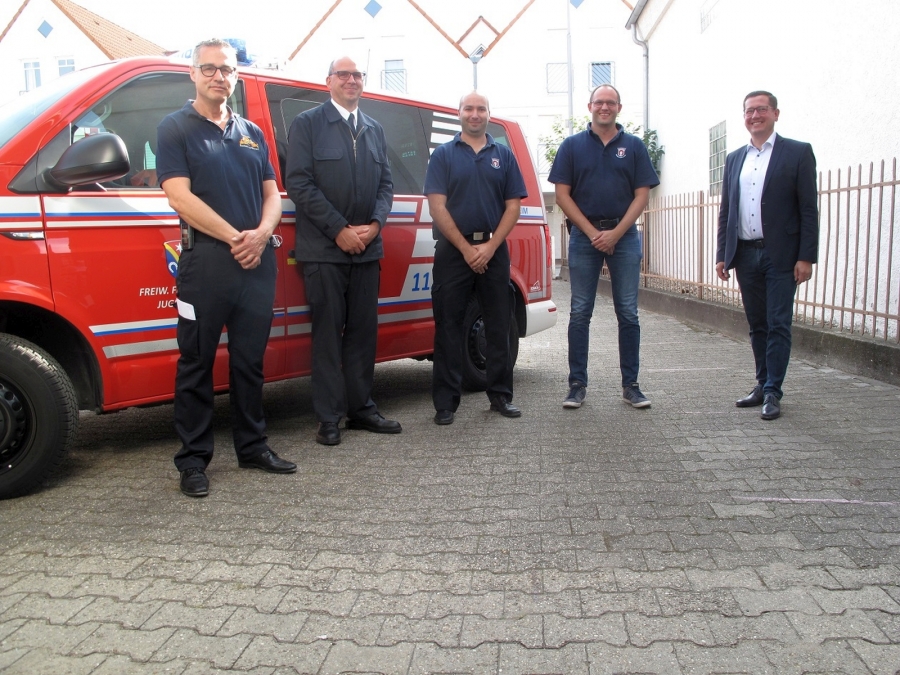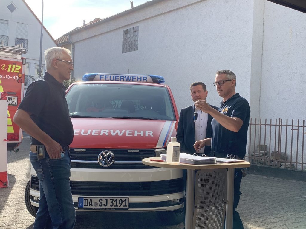 Wehrführer Horst Kuhnke konnte außer die zahlreich erschienenen Mitglieder der Einsatzabteilung, Ehren- und Altersabteilung Herrn Bürgermeister Alexander Kreissl, den stellvertretenden Kreisbrandinspektor Matthias Maurer-Hardt und Gemeindebrandinspektor Stefan Katzer, begrüßen. Nach einem kurzen Bericht über die Personalsituation der Jugenheimer Wehr wurden der Schlüssel des neuen Mannschaftsfahrzeuges von Bürgermeister Kreissl und Gemeindebrandinspektor Katzer an Wehrführer Horst Kuhnke übergeben. Das Fahrzeug hat über 50.000 € gekostet, finanziert außer des 10% Gemeindezuschusses vom Feuerwehrverein Jugenheim aus den Mitgliedsbeiträgen und Festveranstaltungen und ersetzt das 27 Jahre alte Vorgängerfahrzeug.